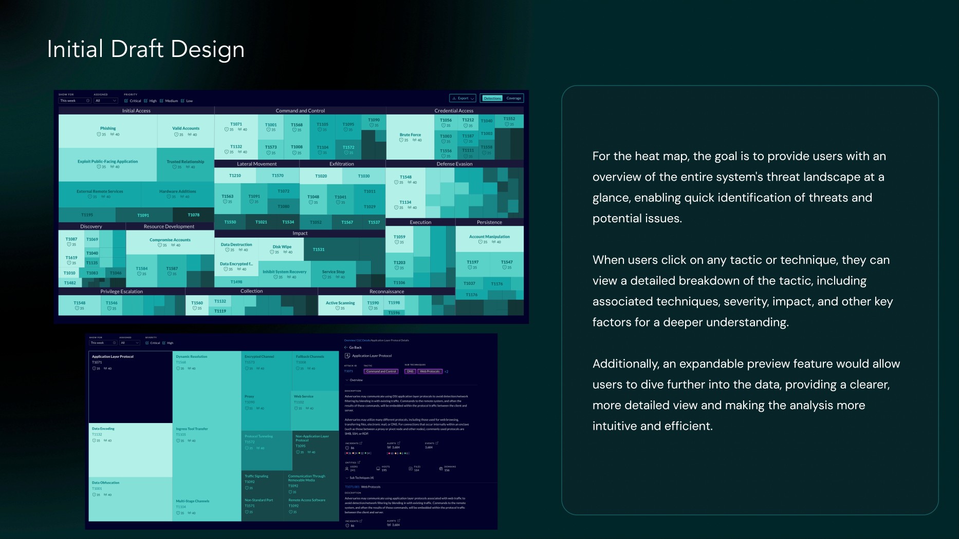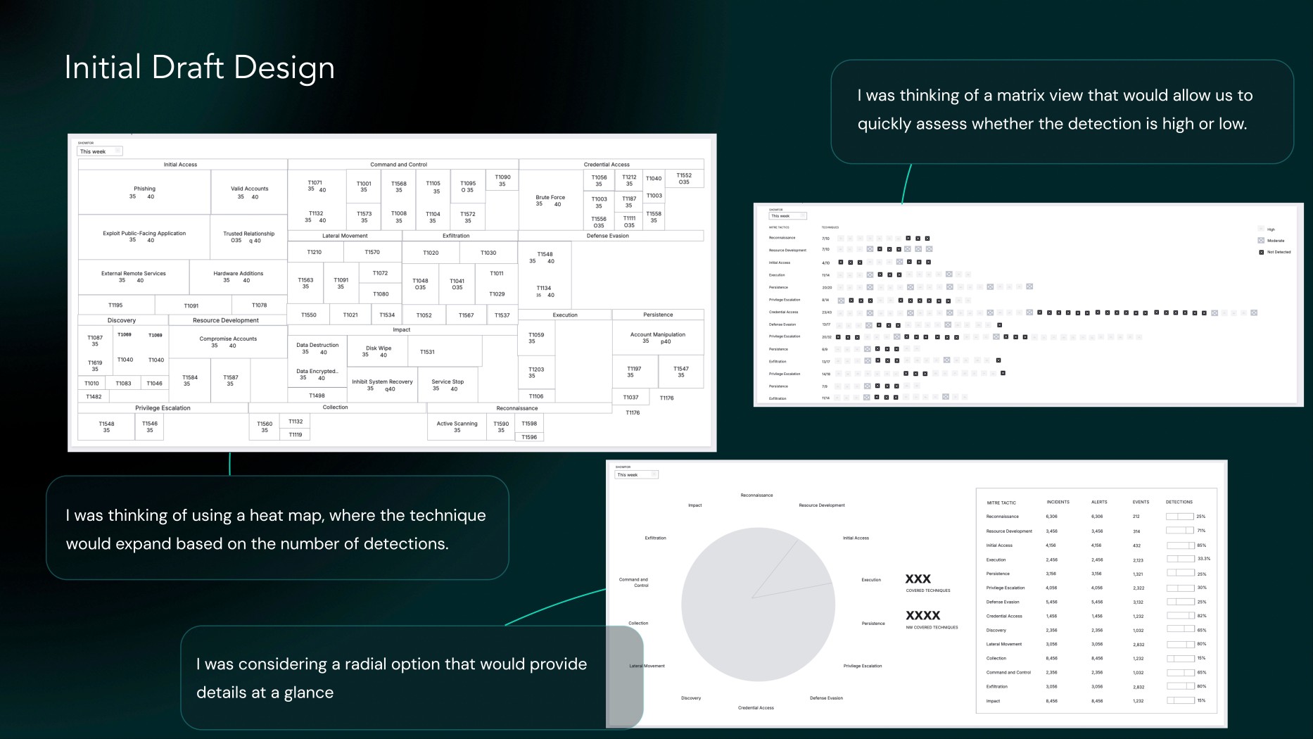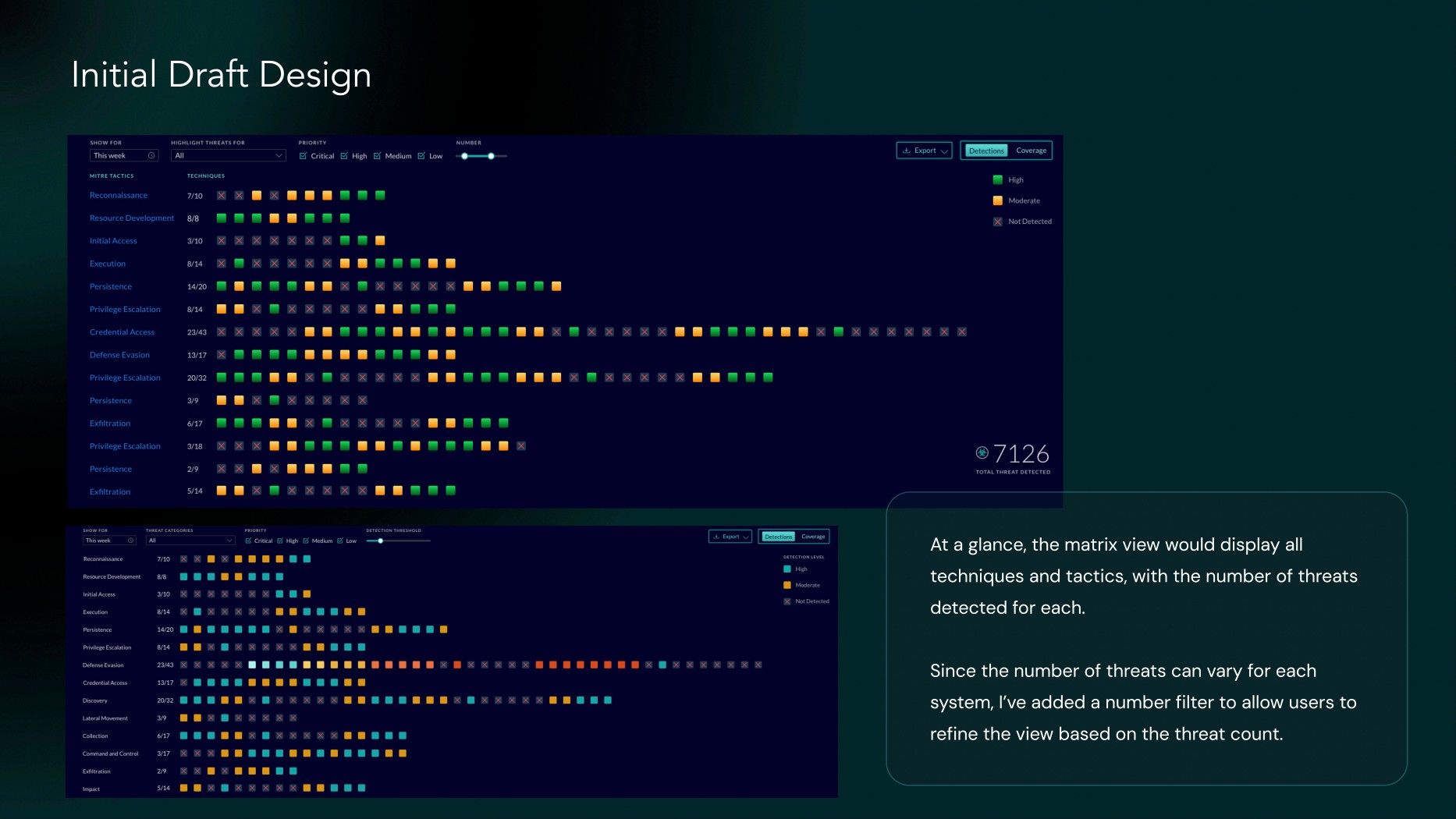 At a glance, users should be able to understand the detected techniques and their significance. The number of threats for each tactic may vary by system, and users will need to filter based on their specific context. There should be a detailed view where the analyst can dig into the specifics, including the severity of incidents, affected hosts, and other relevant details. The visualization UX was still somewhat unclear, requiring further exploration. However, a few key aspects were clear, which I focused on: 1. Users should be able to see detections at a glance. 2. Users should be able to dive deeper into the type of techniques, tactics, and sub-techniques.