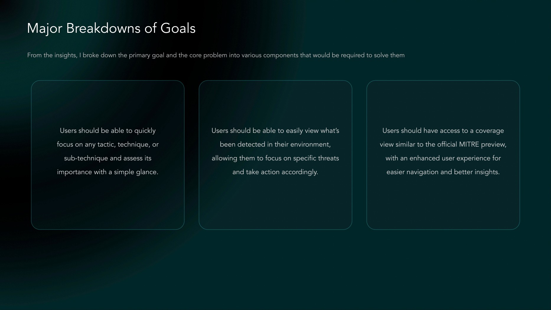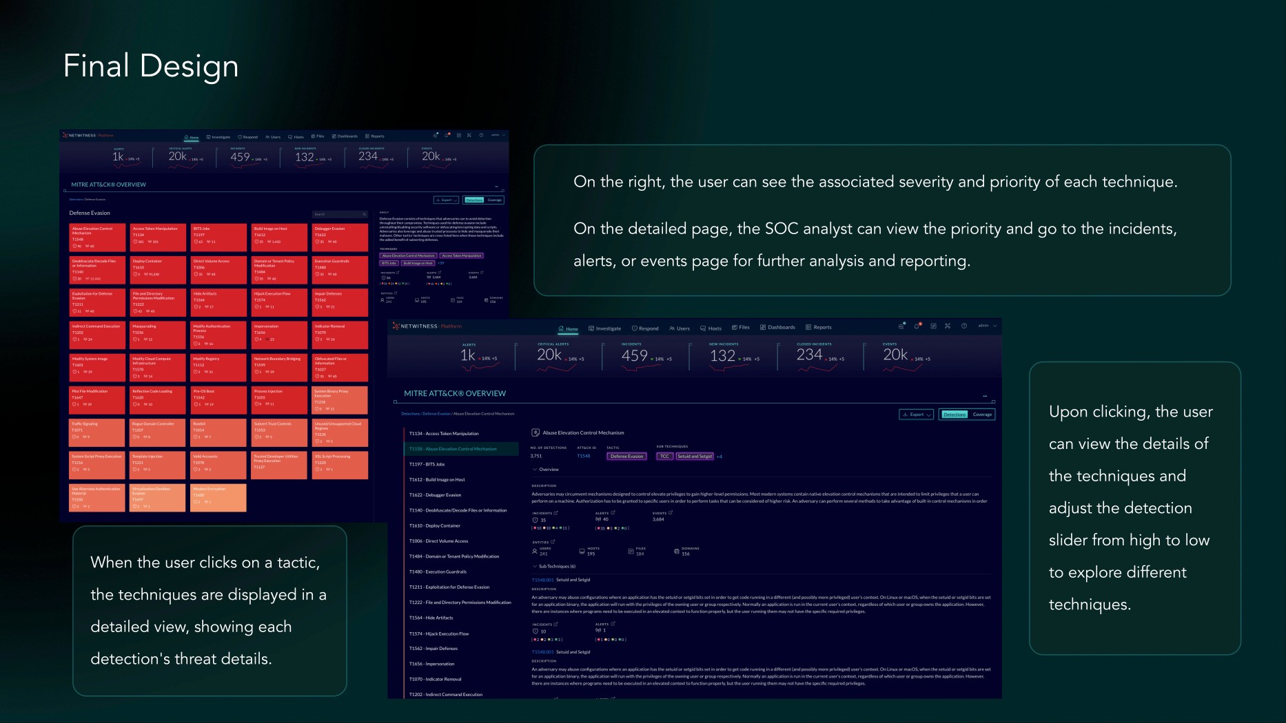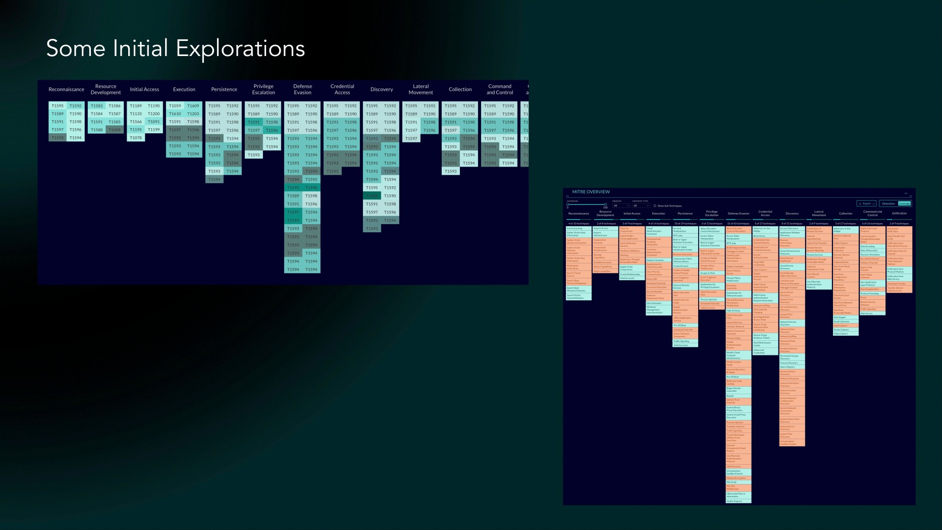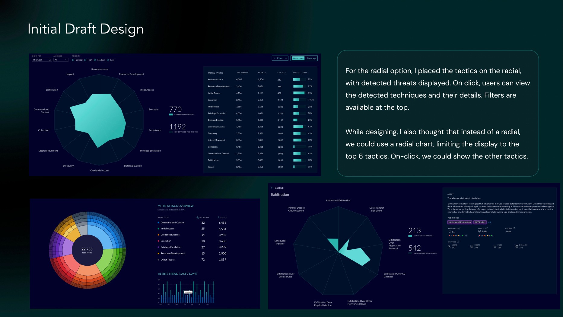 At a glance, users should be able to understand the detected techniques and their significance. The number of threats for each tactic may vary by system, and users will need to filter based on their specific context. There should be a detailed view where the analyst can dig into the specifics, including the severity of incidents, affected hosts, and other relevant details. The visualization UX was still somewhat unclear, requiring further exploration. However, a few key aspects were clear, which I focused on: 1. Users should be able to see detections at a glance. 2. Users should be able to dive deeper into the type of techniques, tactics, and sub-techniques.