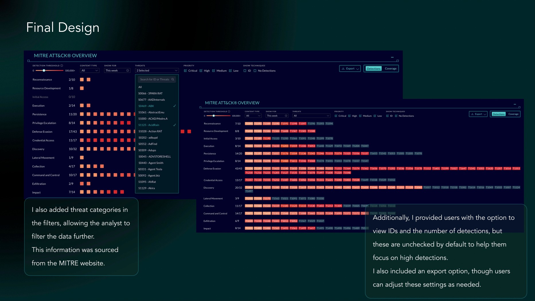 4. Users should be able to explore details, with the option to view technique IDs for those who need them. They also need an export functionality to share the data. Additional filters should be implemented, including a threats categories, allowing analysts to dig deeper into the data.