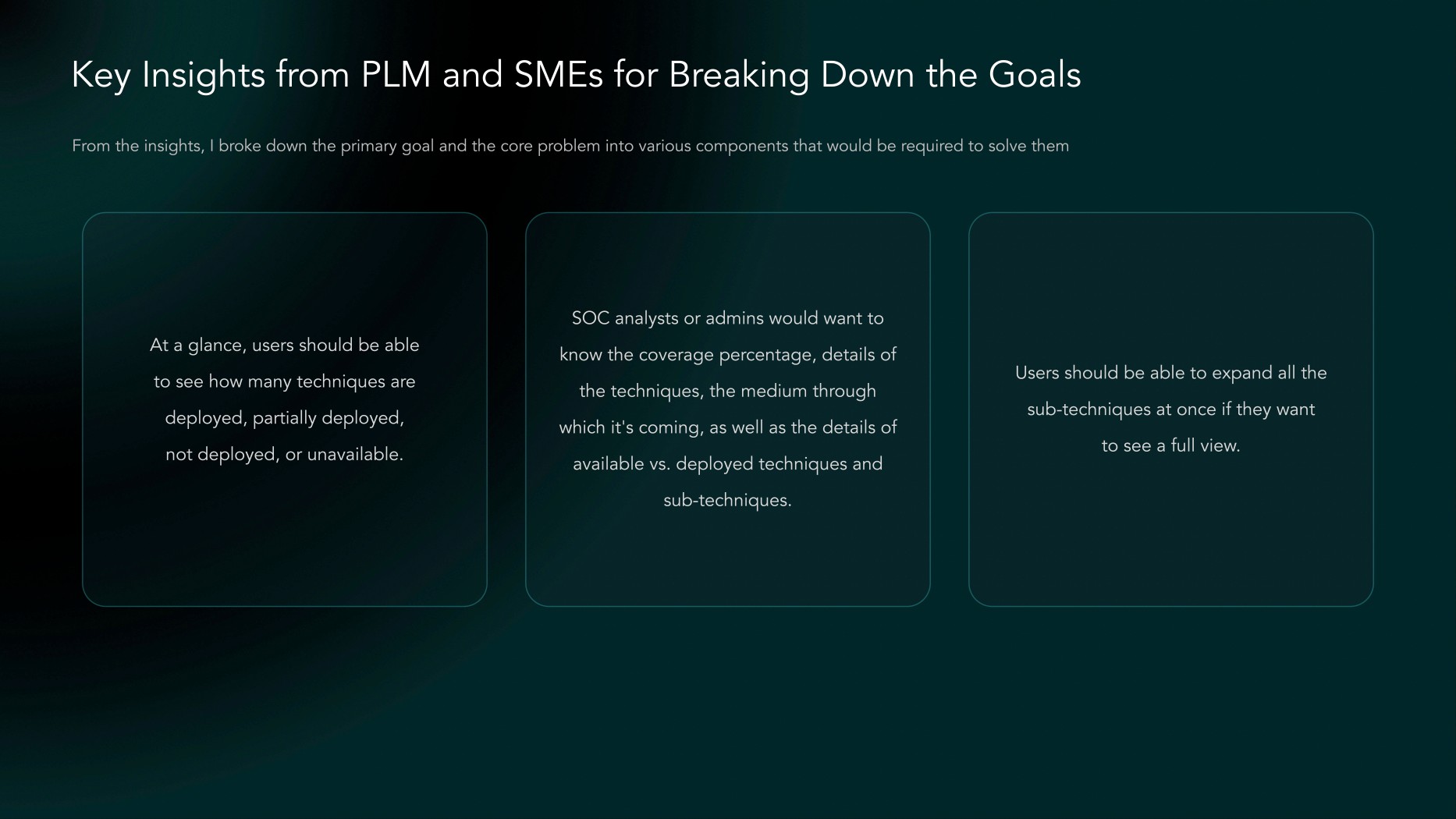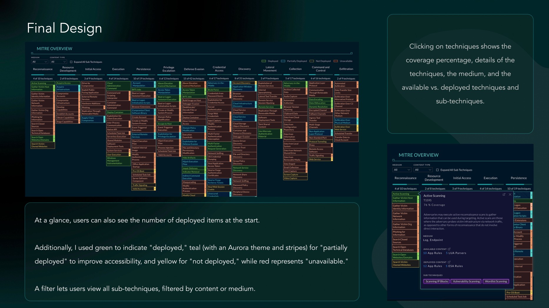 To provide users with seamless access to all MITRE ATT&CK coverage and deployed content in the environment, while ensuring they can easily discover and explore tactics, techniques, and sub-techniques, as well as related content. I connected with a couple of customers to understand how they currently interactaction with the system and whether they would like any changes: 1. Customers are accustomed to the current interface, as it has remained largely the same for over 10 years in official MITRE website as well. 2. They find it difficult to quickly determine the status of mapped content at a glance. 3. Some users expressed a need for better visual indicators to differentiate content status more clearly. 4. They would appreciate a more intuitive way to filter or search for specific content. It looked more like a visual design enhancement on a larger scale, with some UX enhancements as well. Next Steps, Connect with PLM and SMEs to gather their insights as well.