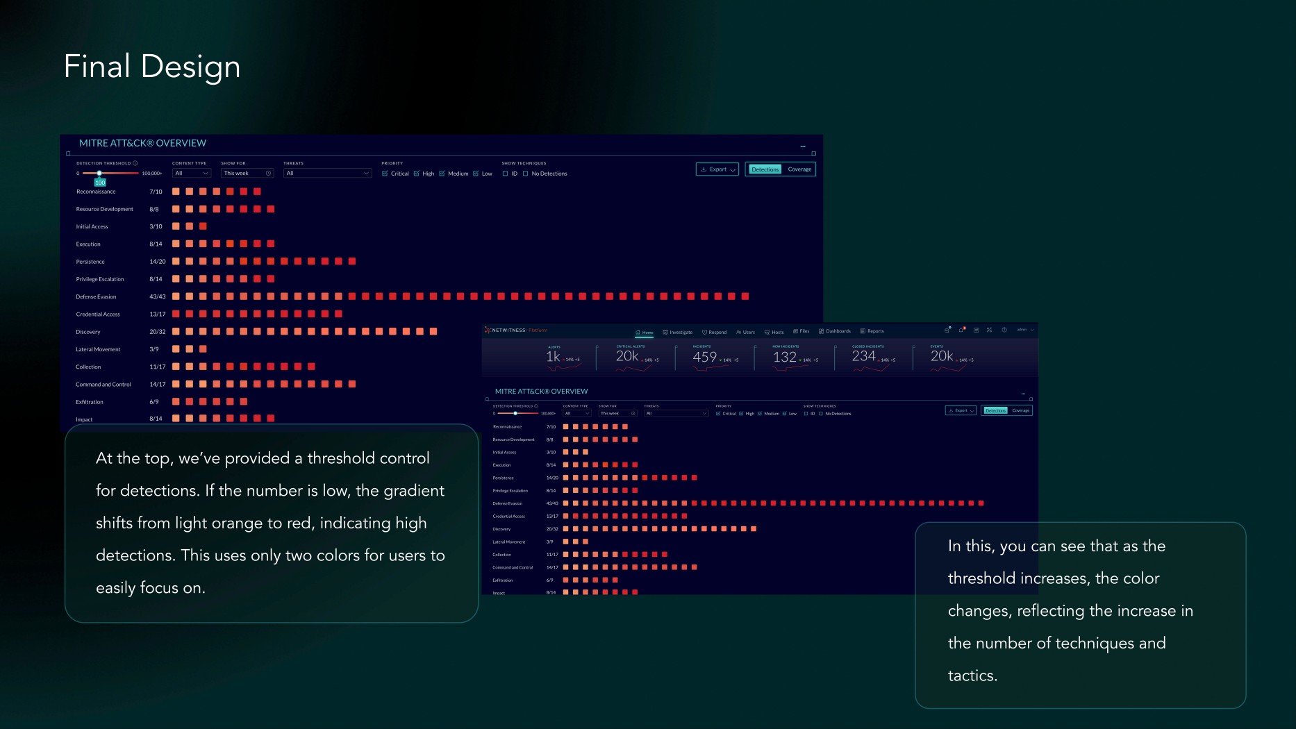 2. In matrix view we presented multiple color options, but users found it difficult to focus. They needed a way to highlight only high detections. No need of number of total threats detected as it don’t bring any value.